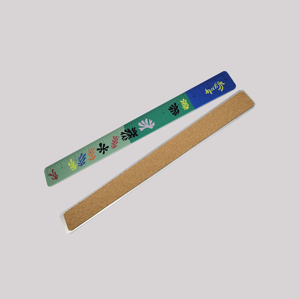 Transform your everyday tools into works of art with The Paper Garden 12" Aluminum Ruler, featuring a vibrant collage of Henri Matisse’s Blue Nude series. Set against a striking green background, this ruler showcases colorful cut-out figures that capture Matisse’s joyful, modern spirit. The metallic shine of the raw aluminum adds a subtle reflective effect, making this piece both eye-catching and practical.