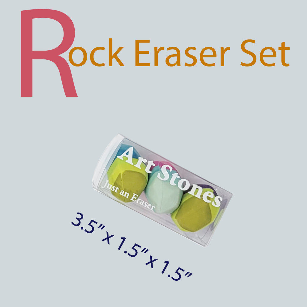 Bring a little geology to your stationery lineup. This Set of 3 Rock Erasers pairs satisfying, stone-like shapes with vibrant multicolor stripes—a fun, tactile upgrade to everyday erasing. Each set includes Pink/Blue, Green/Blue, and Purple/Green erasers packed in a clear 3.5" × 1.5" × 1.5" display box. The front label can be personalized with your museum or institution name, making these a perfect souvenir, checkout impulse item, or fundraising bundle.